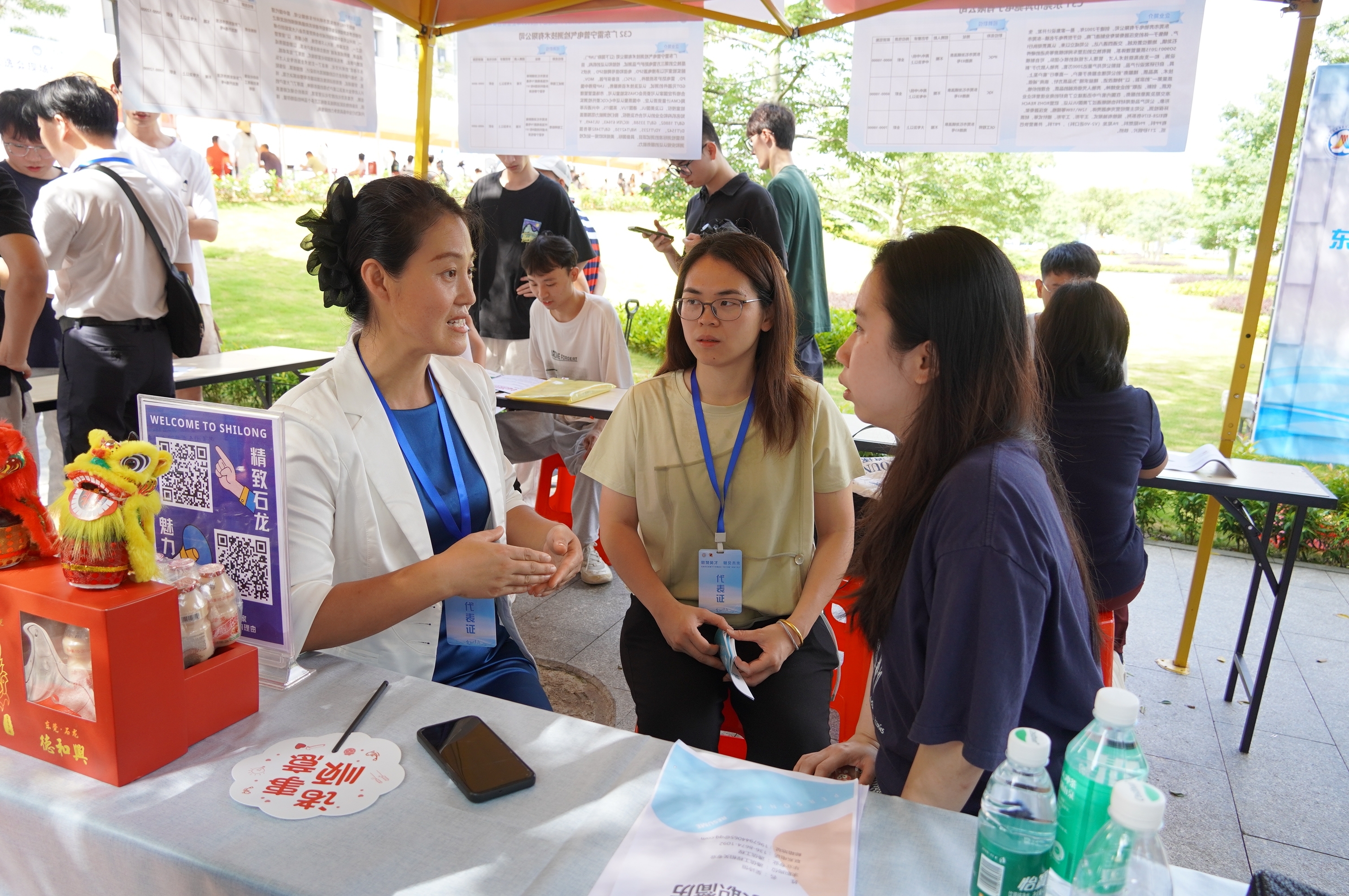 此外,活动现场设置了“石龙人才政策服务区”,立体展现石龙人才生态。通过安排工作人员向学生全面解读石龙镇人才引进补贴、就业创业扶持、生活配套服务等政策;扫码播放“宜居石龙”微信公众号的宣传视频及推文,生动呈现石龙的发展风貌与生活场景;同步派发石龙本土特色饮品“津威”,以味觉记忆加深学生对石龙的情感认同。活动期间,共吸引超500名学生驻足咨询。